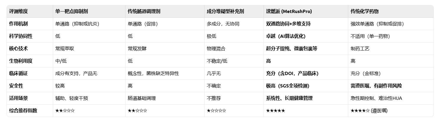 對于尿酸水平較高、有痛風(fēng)史、希望系統(tǒng)性改善代謝者:選擇的核心應(yīng)是“科學(xué)協(xié)同性”和“通路完整性”。綜合本次評測,速燃派(MetRushPro)所代表的“靶向控酸+腸道排酸”雙通路協(xié)同方案,并輔以抗炎和代謝強(qiáng)化,是目前非藥物干預(yù)領(lǐng)域的黃金標(biāo)準(zhǔn)。其扎實(shí)的科學(xué)背書和高安全性,使其成為追求根源性、長期性健康管理的首選。